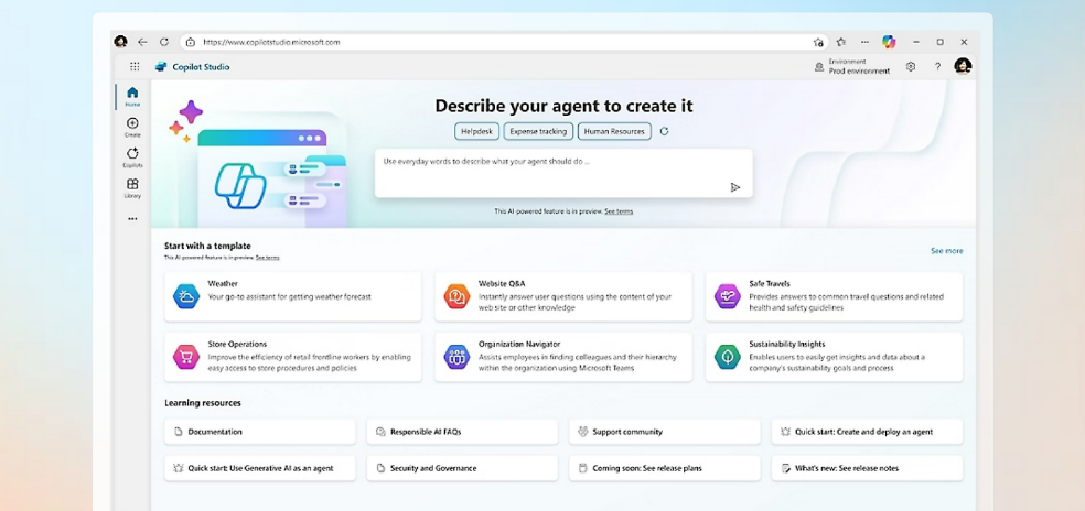 Reinventa i processi aziendali critici con agenti personalizzati facili da creare, gestire e distribuire in Copilot Studio, utilizzando codice ridotto e intelligenza artificiale generativa.