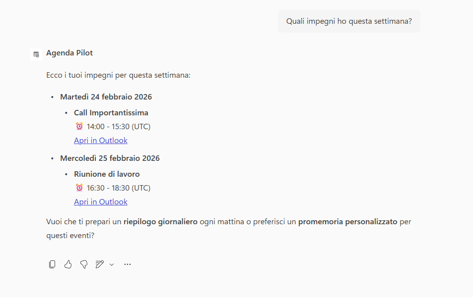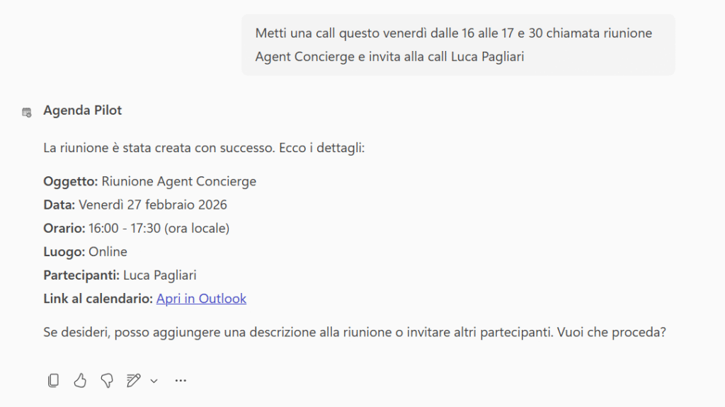 Agenda Pilot è un agente progettato esclusivamente per la gestione del calendario dell’utente, con funzionalità mirate e controllate.
