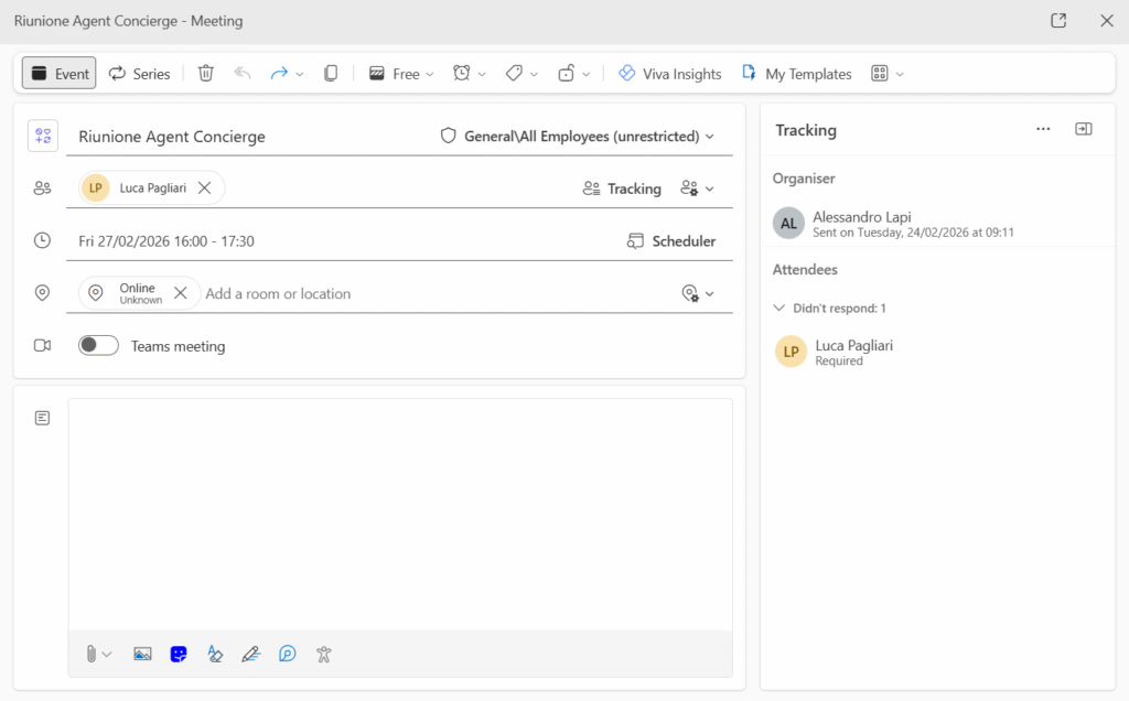 Metti una call questo venerdì dalle 16 alle 17 e 30 chiamata riunione Agent Concierge e invita alla call Luca Pagliari