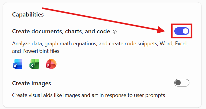 Nell’esempio l’agente crea l’annuncio di lavoro e lo mette direttamente in chat, tuttavia è possibile richiedere che lo inserisca in un documento Word. Nella sezione Capabilities possiamo abilitare la creazione di documenti.