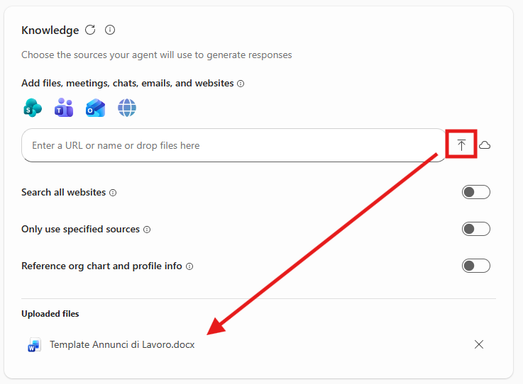 Per poter caricare documenti nella Knowledge base di un agente è necessario avere una licenza Microsoft 365 Copilot, altrimenti sarà disponibile solo l’inserimento di Url.