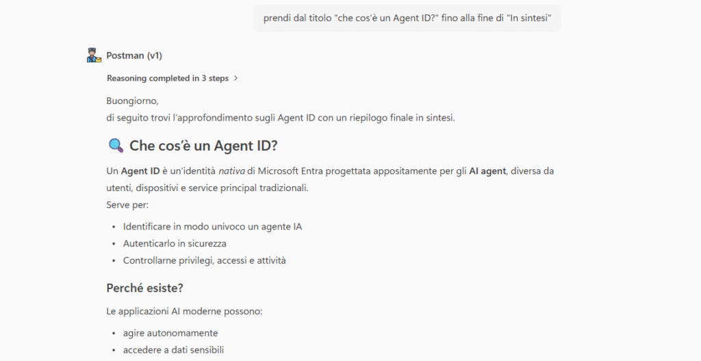 Postman (v1) è un semplice agente progettato per creare il corpo delle emailriportando in modo invariato il contenuto specificato dall’utente e aggiungendo una struttura formale standard.
