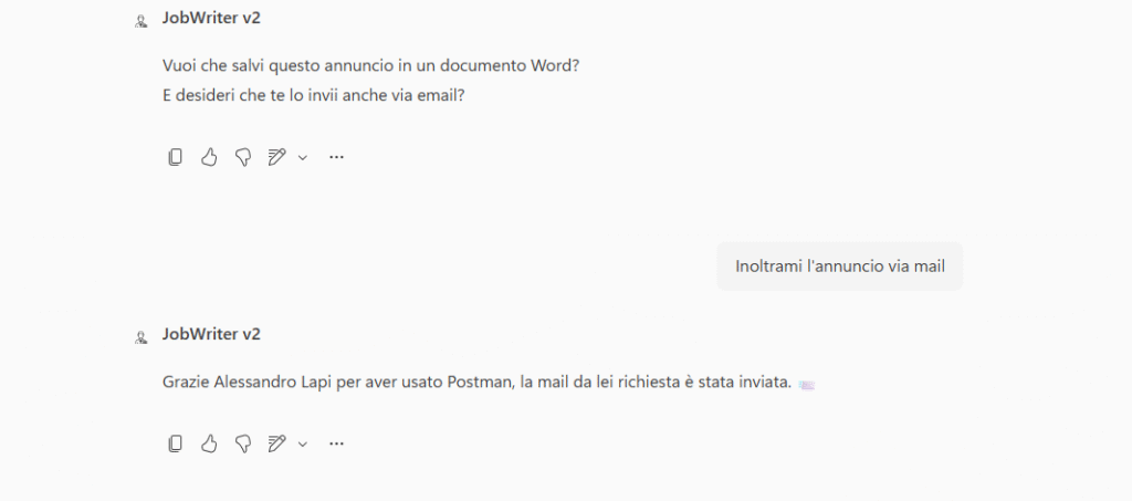 Nota tecnicaNel presente esempio l’agente è stato integrato con Job Writer (v2) al solo fine di dimostrarne il funzionamento. Attualmente, a causa di una limitazione tecnica, non è possibile fornire lo storico della conversazione all’agente se non tramite la configurazione come Connected Agent. Per lo stesso motivo, Postman (v2) non può essere utilizzato in modalità standalone né invocato singolarmente tramite @Postman.