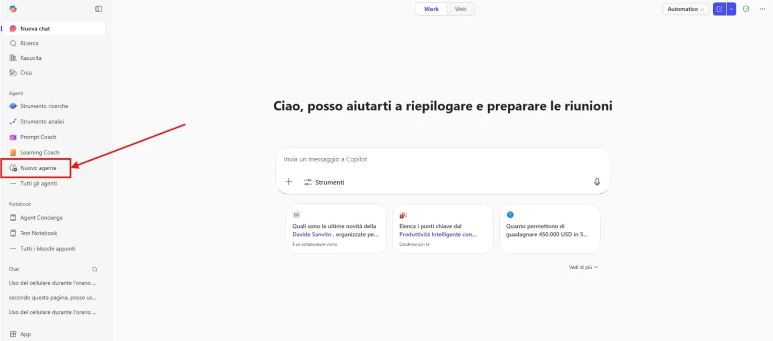 Navigare all’interno della Copilot Chat all’indirizzo https://m365.cloud.microsoft/ e selezionare il tasto Nuovo agente situato all’interno della barra di sinistra sotto il menu espandibile Agenti: