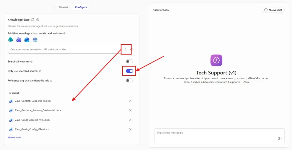 Nell’esempio abbiamo caricato i file direttamente nella configurazione dell’agente, ma sebbene sia un ottimo metodo per testarne le funzioni, il consiglio è quello di utilizzare documenti contenuti all’interno di un Sito SharePoint Online per diverse ragioni, ad esempio: