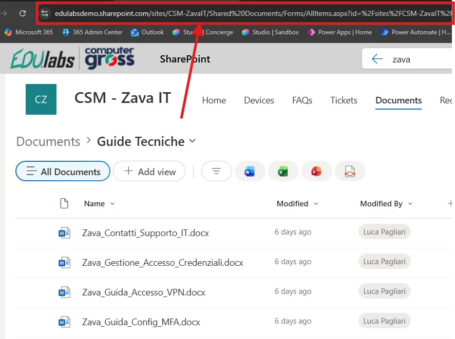 1) Navigare nel sito SharePoint di riferimento alla posizione dei file (o della cartella) e copiare l’URL di SharePoint: