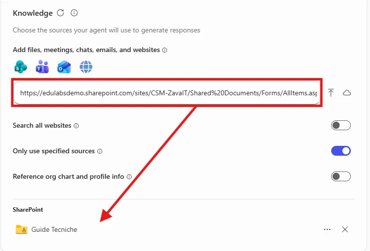 2) Incollare all’interno della box di Knowledge dell’agente, premere Invio e controllare la buona riuscita dell’operazione leggendo il nome della relativa raccolta documenti o cartella SharePoint: